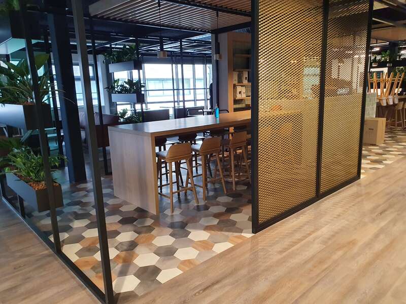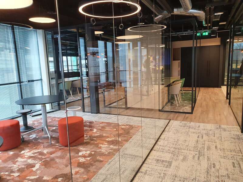 290 m2 PVC vloer, 280 m2 tapijttegels en ruim 50 m2 Tondesign printtapijt